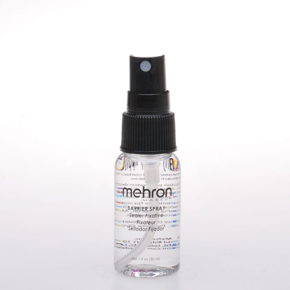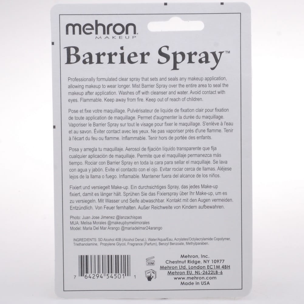 As an under makeup protection, mist Mehron Barrier Spray on clean dry face or body. This will help keep sweat from coming through the makeup. Once the makeup application is complete, mist Barrier Spray over the entire face or body to seal the makeup. This also prevents makeup from rubbing off on costumes. Remove with makeup remover followed by soap and water.
